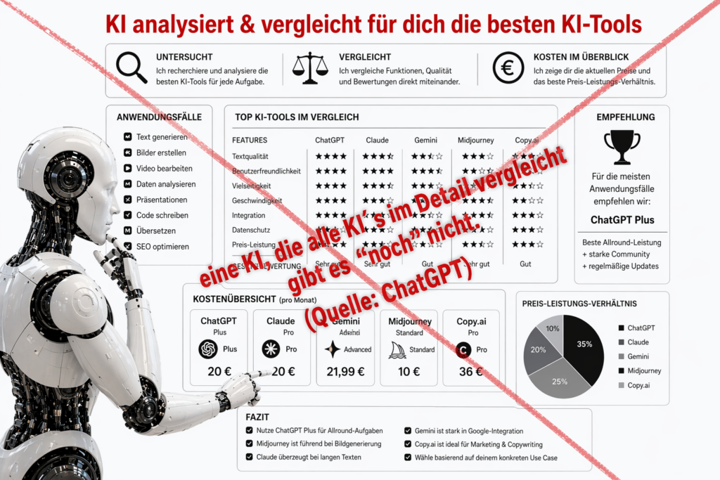 Ergebnis: Die KI wird zur „Eierlegenden Woll-Milch-Sau“: theoretisch alles super aber in der Kombination praktisch nichts richtig.